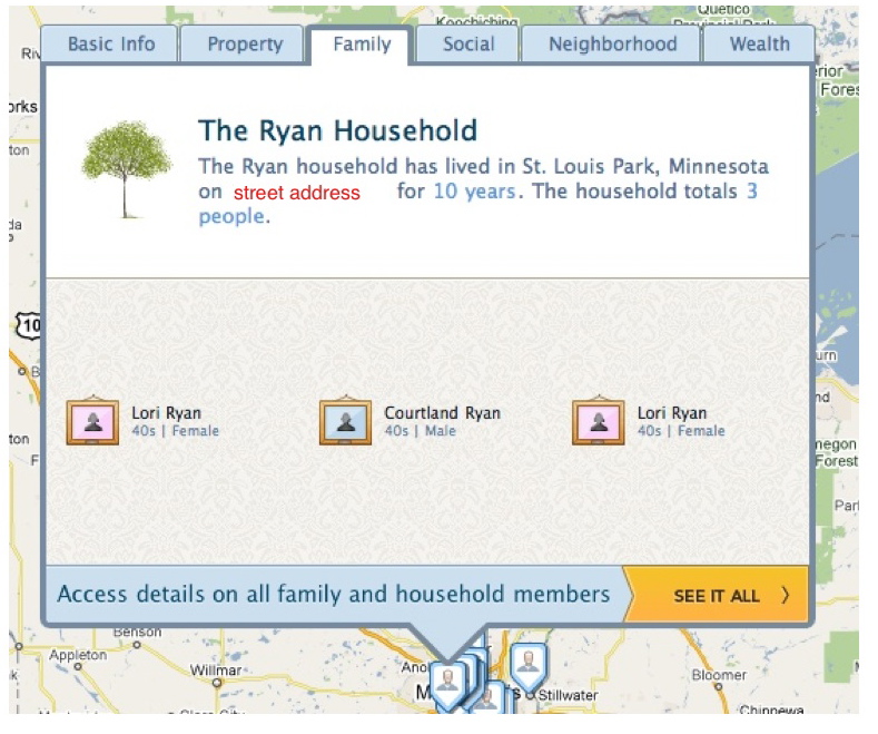 Notice the tabs on top: Basic info (the page above) property, family, social, neighborhood and wealth. I found some of the information to be accurate but not all of it. Where I live was correct. You can actually see my house.
