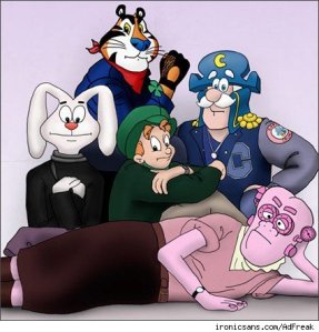 Let’s get real.   General Mills and Kellogg’s aren’t forcing anyone to buy these products.  We, as consumers, need to take responsibility for our actions.  And the little kids, who these mascots seem to influence, aren’t the ones at the register paying for this stuff. It’s the parents.