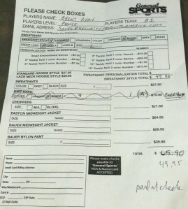 We thought we had ordered a Youth Large, the size our son tried on a few weeks ago. But when my husband put Large on the order form he didn’t clarify Youth or Adult and we ended up with a Men’s Large. Unfortunately, all of the ordering and trying-on took place at the ice rink, not the store. There wasn’t a store rep to explain and go over the order sheets, just our team manager.